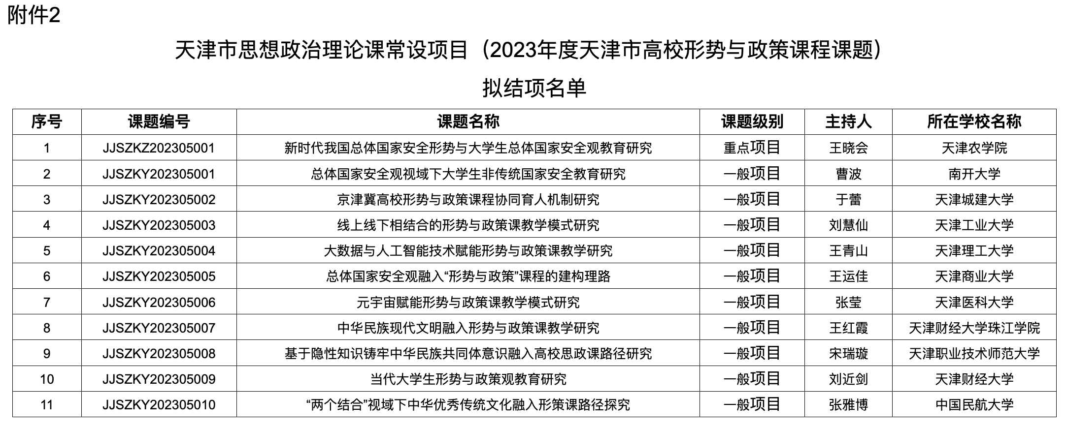 2.天津市思想政治理论课常设项目(2023年度天津市高校形势与政策课程课题)拟结项名单
