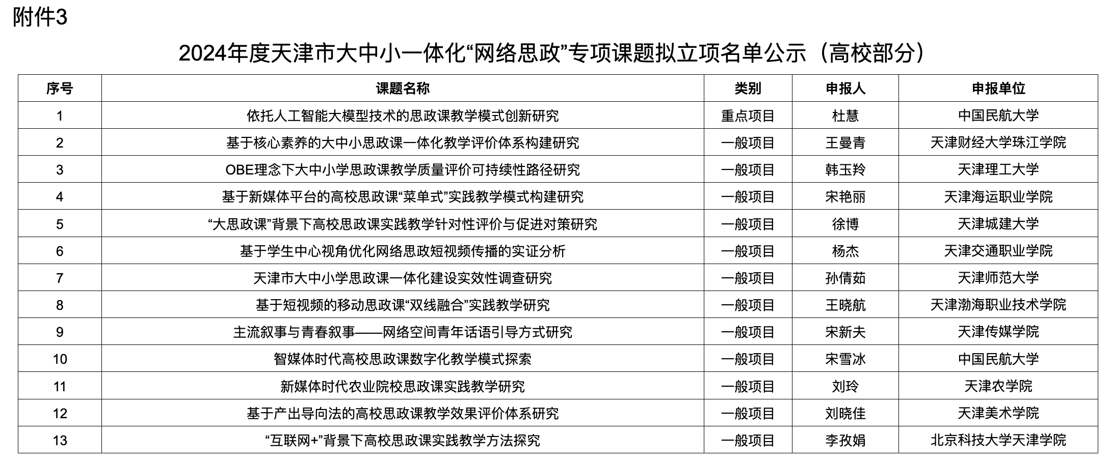 3.2024年度天津市大中小一体化“网络思政”专项课题拟立项名单公示(高校部分)