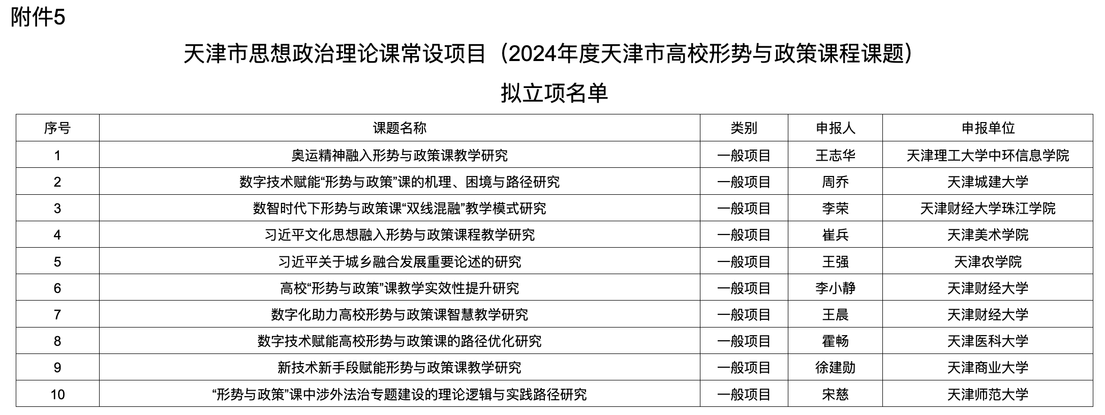 5.天津市思想政治理论课常设项目(2024年度天津市高校形势与政策课程课题)拟立项名单公示